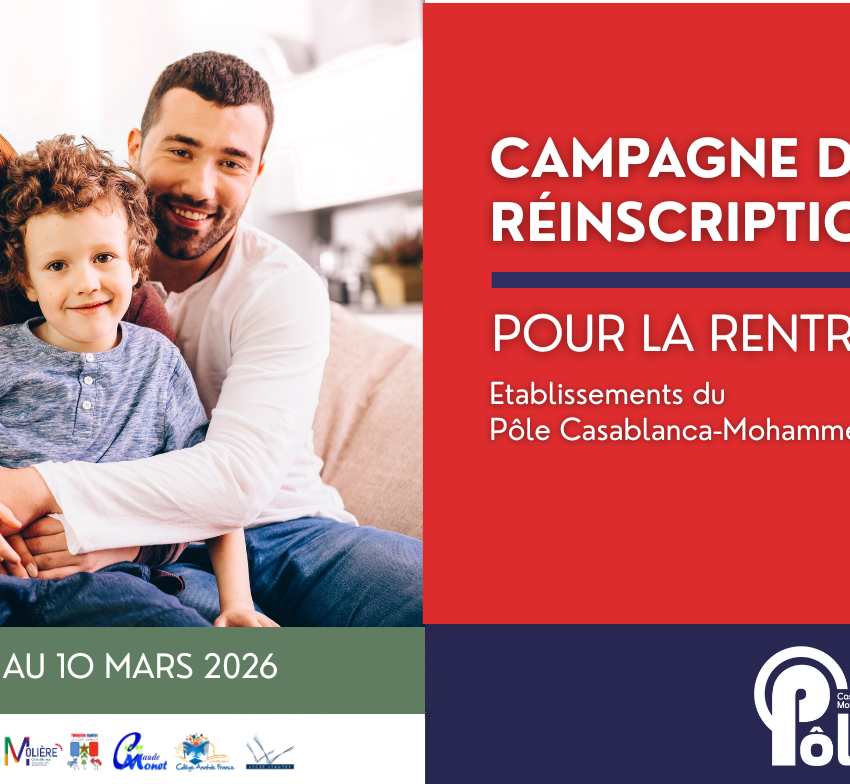 Chères familles, La campagne de réinscription du pôle Casablanca–Mohammedia pour l’année scolaire 2026-2027 débute ce jour et se clôturera