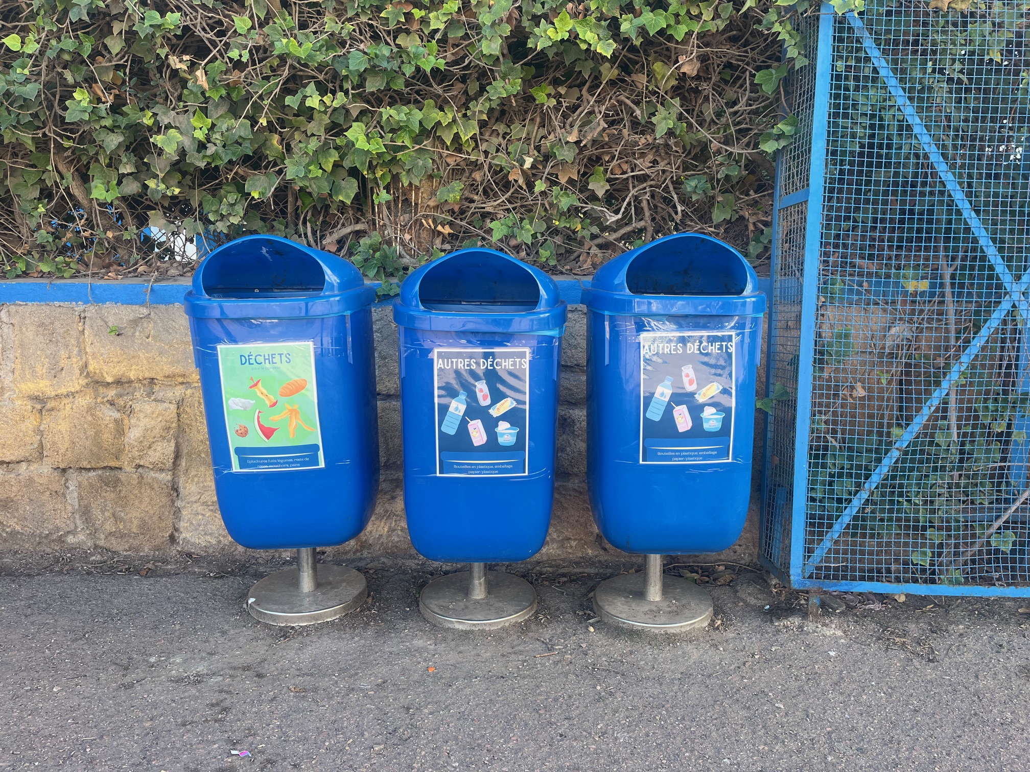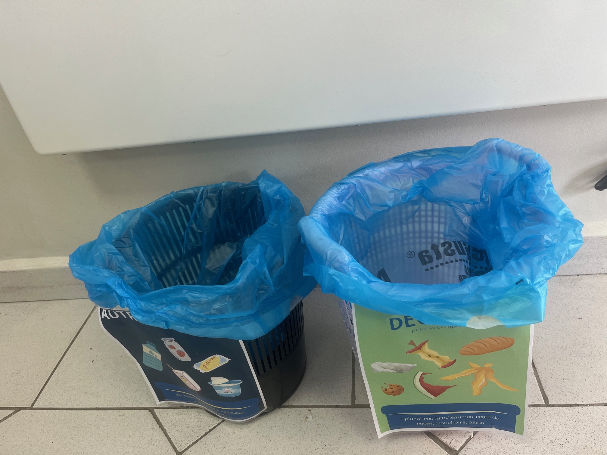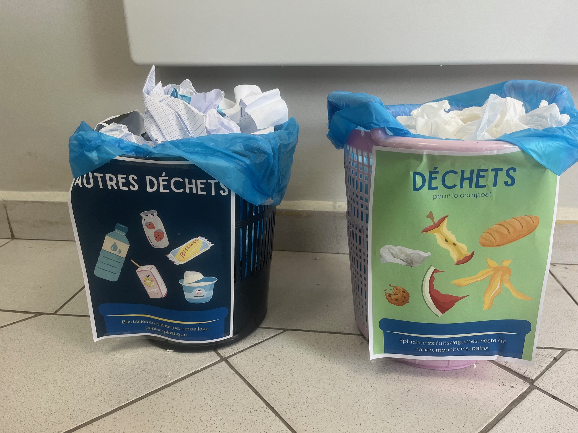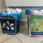 Suite au projet de compostage des CP, deux affiches de tri ont été installées sur les poubelles des cours (et étudiées précédemment en classe) : une pour le compost (épluchures fruits/légumes, mouchoirs, biscuits…) et une seconde pour le reste des déchets (emballages en plastique et en carton…).