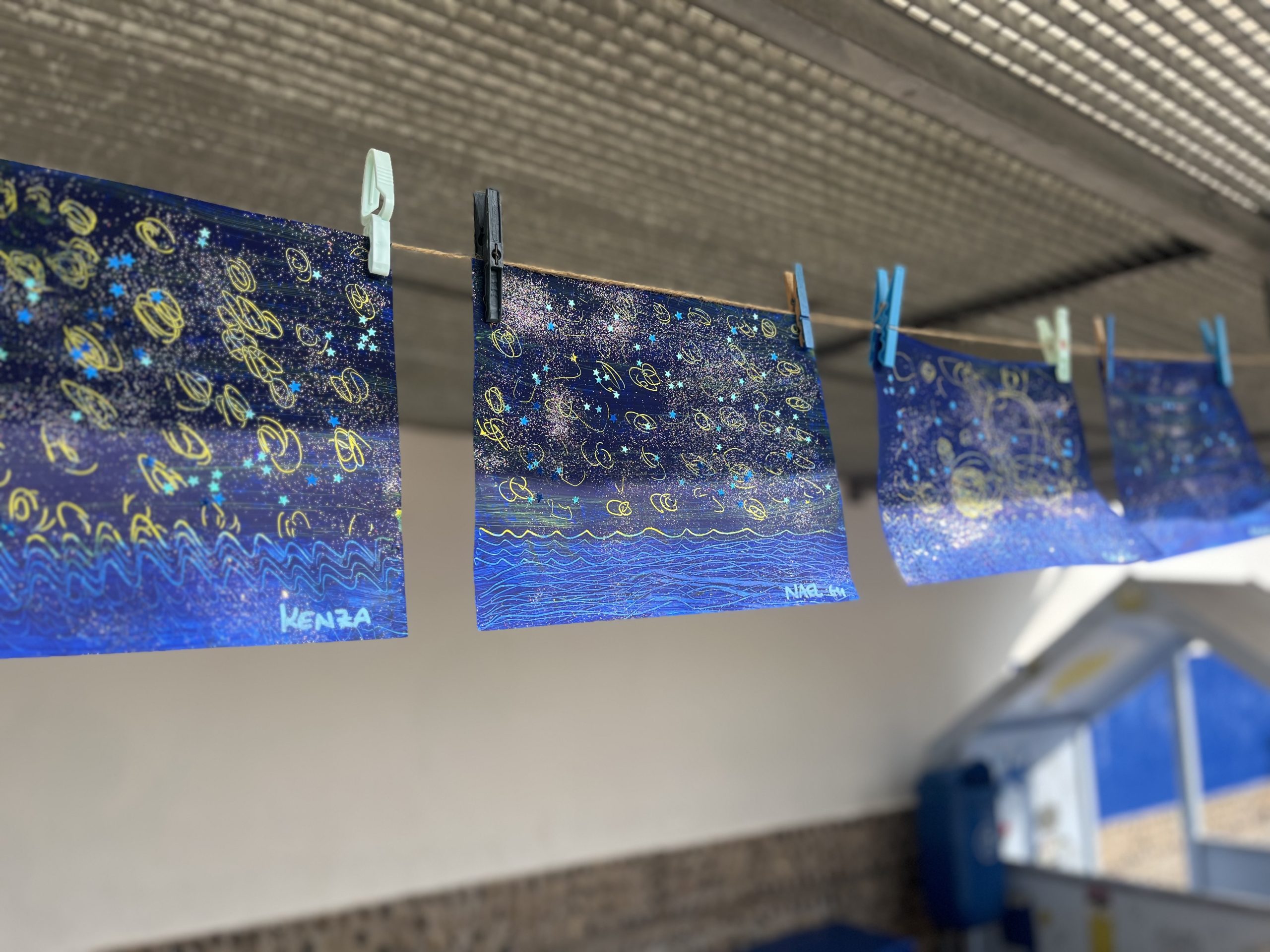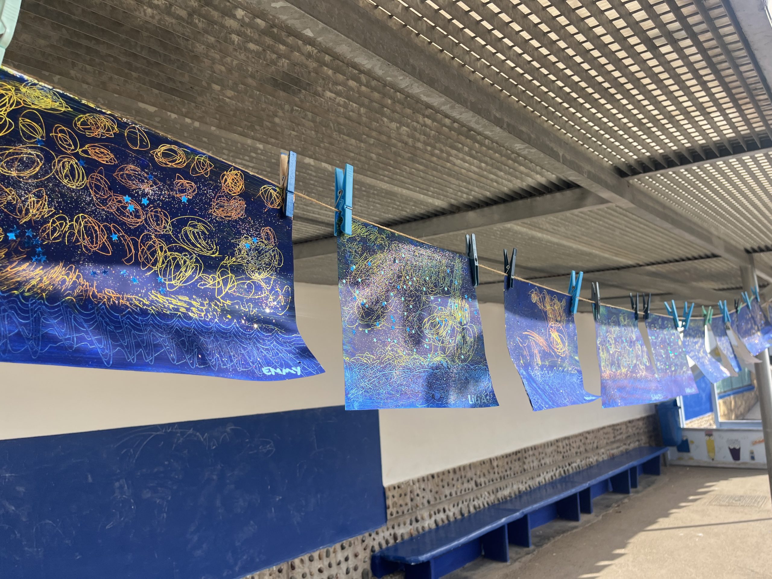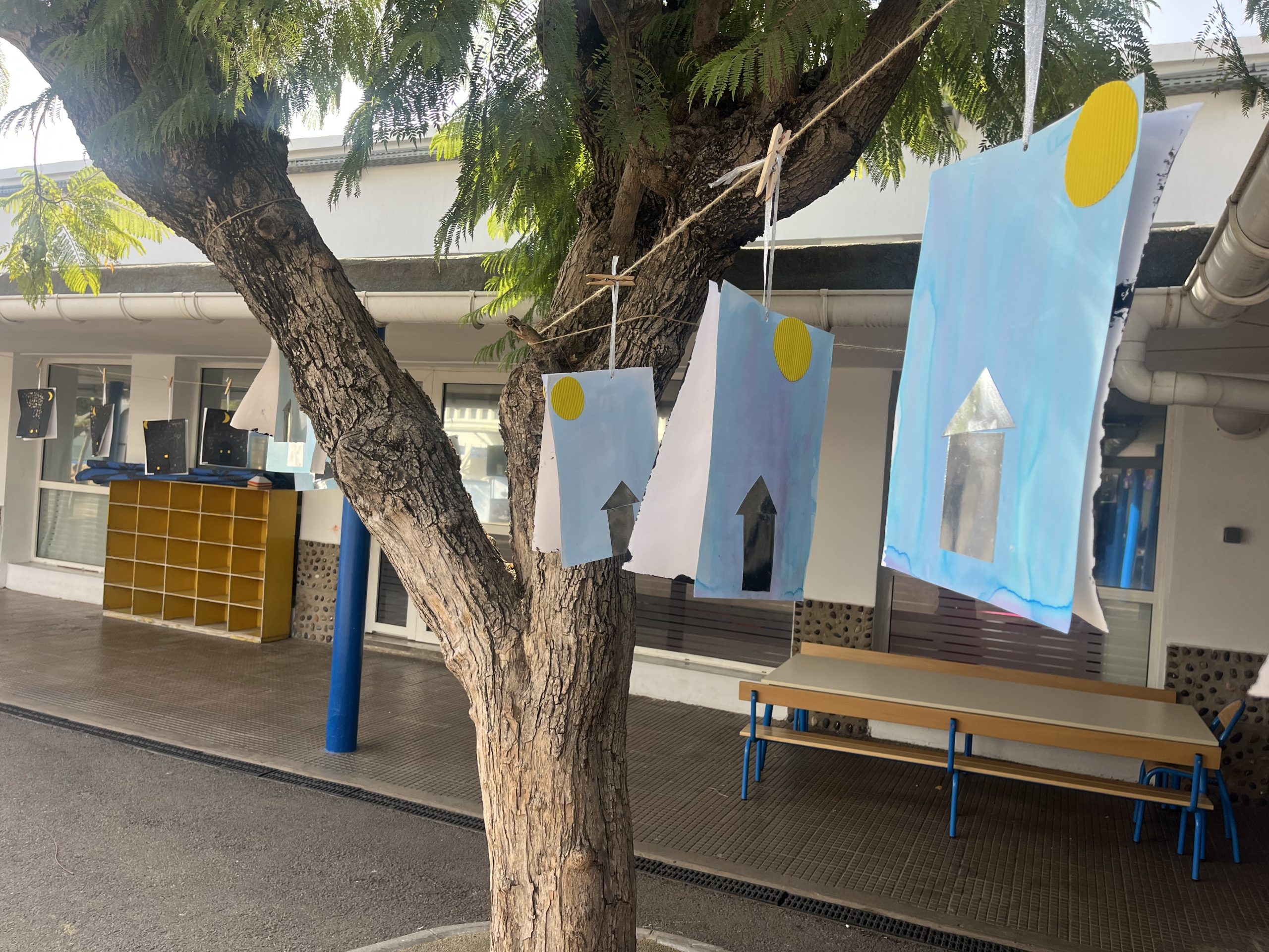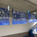 Les élèves de moyenne section ont participé à La Grande Lessive 2025 sur le thème “Nuit et jour, réfléchir les lumières!”. Chacun a réalisé une belle œuvre pleine de paillettes, de contrastes et d’astres. Les parents ont ensuite été invités à venir admirer leurs créations suspendues pour l’occasion.