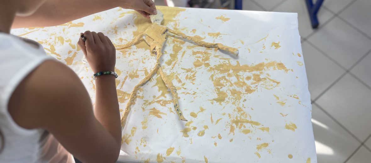 Une première proposition a été générée grâce à l’IA, servant de point de départ au travail créatif. Les élèves, guidés par l’artiste et les enseignants, ont ensuite donné vie à ce personnage en le transformant en une véritable création plastique.